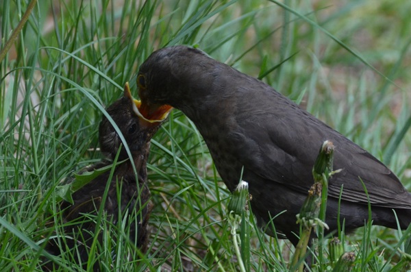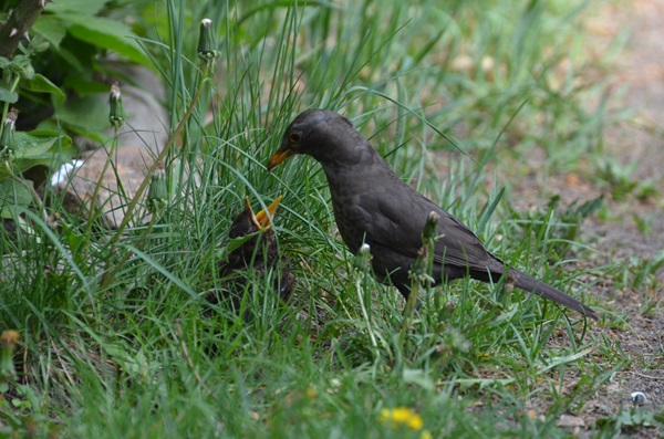 Die Amsel ist kein Zugvogel, darum fangen die Balz und die Brut früh an. Ende April fand ich eine blaue Eierschale auf dem Weg zum See, also waren die Küken jetzt bereits sicher geschlüpft. Auf dem Rückweg fragte mich mein Nachbar um Rat, weil auf seinem Grundstück ein großes Vogelküken im Gras saß. Größe und Aussehen: offensichtlich Amselnachwuchs. Ich empfahl, Handschuhe anzuziehen und den kleinen Unglückswurm irgendwo in eine Hecke zu setzen. Allerdings war ich mir bezüglich der Hilflosigkeit nicht so ganz sicher (siehe oben). Circa 1 Stunde später kam mein Sohn ganz aufgelöst von draußen rein: da wäre eine kleiner Vogel, offensichtlich krank! Nein, mein Lieber, das ist nur der Familien-Trottel, der die Rettungsversuche der Menschen ignoriert! Und dass er von der Hecke bis zu uns gekommen war, zeugte von bereits ausgebildeter Mobilität. Und natürlich schrie er nach Futter! Als sich die Amsel-Mama mit einem „Leckerli“ im Schnabel näherte, zogen wir uns zurück und beobachteten die Fürsorglichkeit aus der Ferne. Denn, als das erbärmlich piepsende Jungvögelchen den fetten Regenwurm von Mama in den Schlund gestopft bekam, war es sofort ruhig. Und ich sperrte meine Katzen ein. Die folgenden Fotos sind von der nächsten Fütterung!
