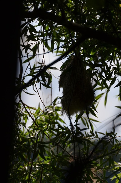 baut kunstvolle, honigmelonengroße Nester, die wie Beutel (Name!) in etwa 3 m Höhe in den Baumzweigen baumeln. Ich habe an zwei Stellen am Fließ diese Beutel schon gesehen, 2017 waren sie weg, 2018 war wieder einer da.