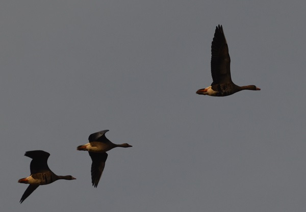 Im Oktober und November ist am Fließ die Hölle los! Tausende Gänse kommen und gehen, abends ist manchmal der ganze Horizont „schwarz“. Ich weiß schon länger, dass es nicht nur Graugänse sind. Als ich eine kleine „Abteilung“ am Himmel ausmachte, die nicht so typische Schnatterlaute von sich gab, sondern ein leiseres, helleres „quitt, quitt, quitt“, machte ich Fotos. Und so bekam ich ein paar neue Bilder von der Bläßgans.