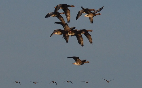 Das Flugverhalten der Bläßgänse unterscheidet sich von dem der Graugänse und ist für „Kenner“ ein sicheres Unterscheidungsmerkmal. Sie fliegen nämlich auch gerne mal im Pulk!