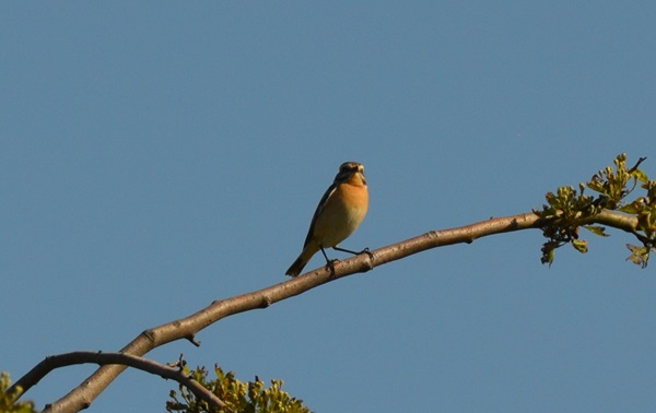 Im Mai 2016 fotografierte ich mal wieder (in Ermangelung spektakulärer Motive) alle kleinen Vögel im herrlichen Sonnenlicht. Ein mir unbekannter Geselle zwitscherte fröhlich von einem hohen Zweig im Maulbeerbaum, flog aber beharrlich zum nächsten Baum, wenn ich mich näherte. Irgendwann bekam ich an der alten Eiche sogar „Großaufnahmen“. Trotzdem wusste ich immer noch nicht, was für ein Vogel das war. Mein schlaues Vogelbuch war keine Hilfe, das Internet musste suchen. Aber dort fand ich ein Foto, dass einem von meinen genug ähnlich war, um eine Identifizierung vorzunehmen. Es war ein Braunkehlchen-Weibchen.