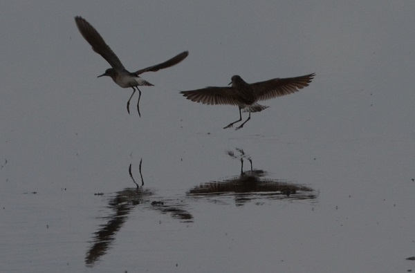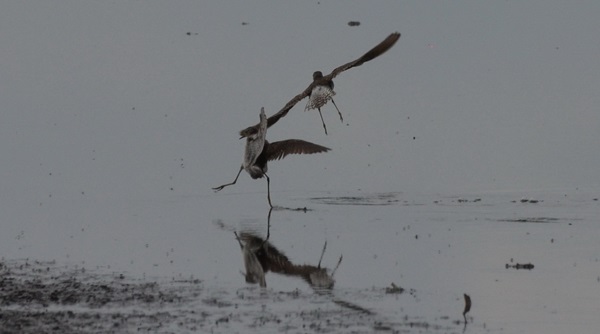 Von dem „roten“ Vogel (Sichelstrandläufer) konnte ich nur ein Paar ausmachen, aber von dem etwas kleineren und deutlich schlankeren Watvogel gab es geschätzt 6-10, und die machten auch ein bisschen Spektakel. Ich habe so viele lustige Flugbilder, kann aber nur die Besten zeigen.