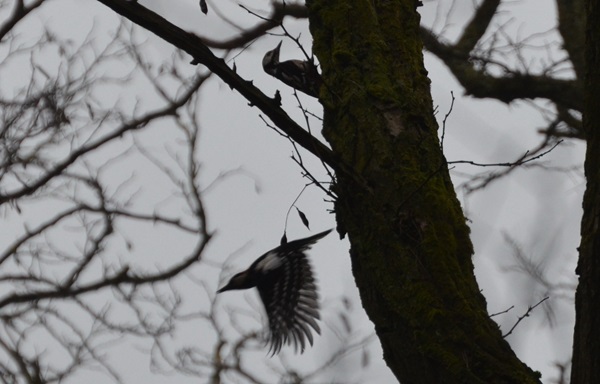 Ich erkenne Buntspechte im Flug (genau genommen: Spechte allgemein), denn sie fliegen die meiste Zeit mit angelegten Flügeln und sehen darum aus wie kleine Raketen, die sich wellenförmig durch den Wald- und Gartenluftraum bewegen. Dann stoßen sie manchmal lustige Klick-Laute aus.