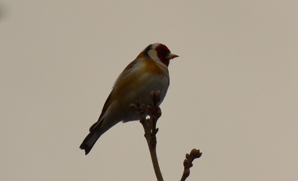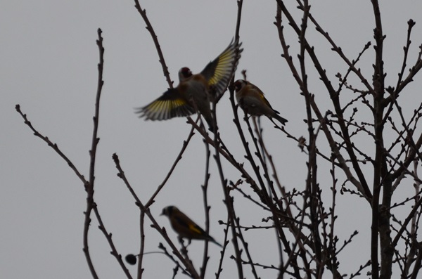 An der großen Wiese, die in der direkten Nachbarschaft des ehemaligen Sonnenblumenfeldes liegt, habe ich im März eine große Gruppe Vögel ausgemacht und fotografiert. Es hätten Zeisige sein können oder Buchfinken oder Sperlinge. Sie alle sind ungefähr gleich groß und treten dort in Schwärmen auf. Aber bei der „Nachbearbeitung“ der Fotos stellte ich fest, dass ich erstmalig Distelfinken „erwischt“ hatte. Es war sogar ein Flugbild dabei, auf dem die gelben Streifen auf den Flügeln zu sehen waren, die so typisch für diesen Vogel sein sollen. Dabei fiel mir auf, dass diese Art gerne die oberen Plätze im Baum beansprucht, während die anderen Finken auch mal weiter unten Platz nehmen.