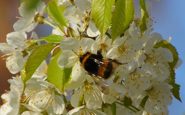 Sie ist etwas kleiner als die Erdhummel, die in meinem Garten überwiegt. Der Rücken der Baumhummel ist kräftig orange und flauschig. Sonst ist sie schwarz und hat ein weißes Schwanzende.