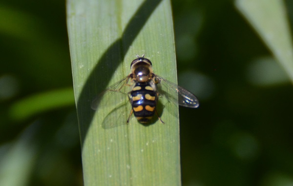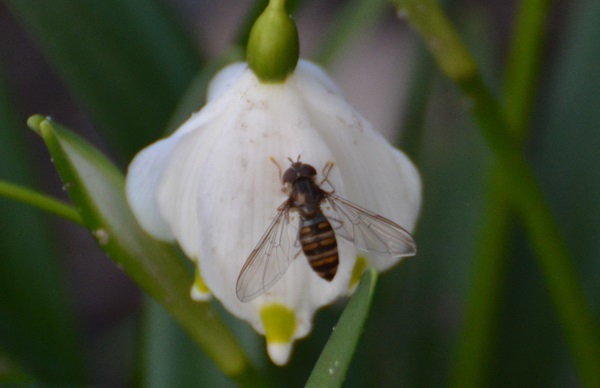 Diese Fliege ähnelt farblich mehr der Biene, sie ist filigran und hat eine schwarz-weiß-gelbe Rückenzeichnung. Groß wie Stubenfliege ist sie aber viel schlanker und schon im Februar an den Frühlingsblühern anzutreffen (daher wahrscheinlich der Name). Ab April habe ich sie bisher nicht mehr gesehen.