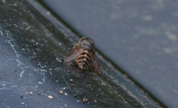 Der Unterschied zur Honigbiene ist bei näherer Betrachtung ziemlich deutlich, aber da sie in Größe und Verhalten der „Schwester“ ähnelt, kann man sie leicht verwechseln. Bisher habe ich sie nur vereinzelt angetroffen, und sie geht auch an Blumen. Am Mist habe ich sie noch nie gesehen.