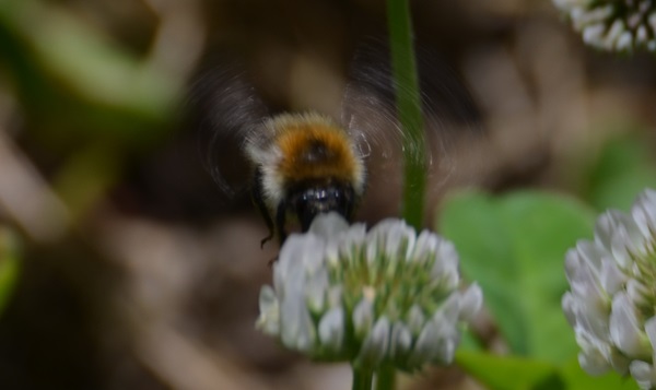 Die Ackerhummel taucht erst später auf, und sie ist deutlich kleiner als die Erdhummel. Auf einem Bild kann man das gut vergleichen. Sie hat einen ganz flauschigen, orangen Schultergürtel, weshalb ich sie zuerst für einen Wollschweber gehalten habe. Aber der hat nicht kontrastreichen schwarz-orangen Querstreifen am Körperende. Die Ackerhummel ist nicht wählerisch, ich habe sie an vielen verschiedenen Blüten entdeckt.