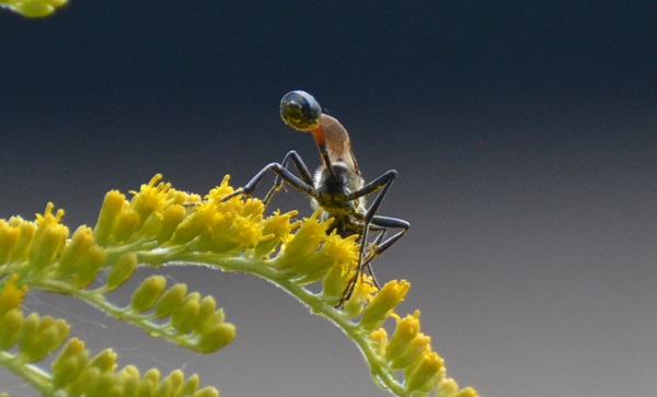 Wenn mir scharfe Bilder und eine Identifizierung gelungen sind, füge ich nur noch Bilder dazu, die etwas Außergewöhnliches haben. Die Fotos zeigen eine Sandwespe, die scheinbar in der Goldrute herum klettert wie Extremsportler an einer Steilwand. Nur, dass die Wespe mehr „Hände“ hat.