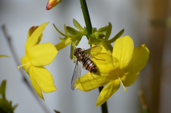 Der Winterjasmin blüht in diesem Jahr (2019) lange. Die Winterschwebflieg kam erst im März und freute sich über die Blüten. Sie ist übrigens kaum größer als eine Mücke!