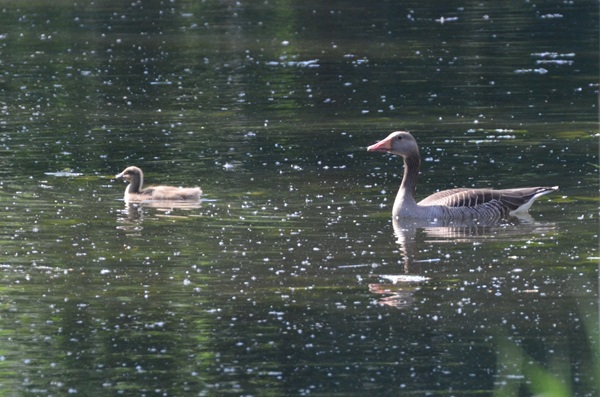 An meinem See brüten die Graugänse jetzt auch. Im letzten Juni-Drittel fotografierte ich eine 4-köpfige Familie etwa in See-Mitte (Bildqualität eher mäßig), aber die Jungvögel unterscheiden sich doch schon deutlich von den flauschigen Fell-Kugeln aus dem Mai.