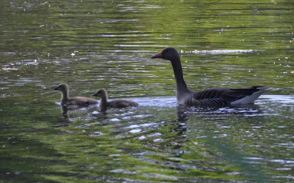 Die drei Familien sahen mich als Grund an, davon zu schwimmen, aber sie waren nicht panisch. Ich folgte ihnen auch sehr langsam, damit sie ihren Vorsprung behielten. Was mich begeisterte, war, dass sie sich zusammen taten und als Pulk schwammen, auch wenn das Einzelkindküken sich lieber für das Ufergestrüpp interessierte, als auf seine Sicherheit zu achten (auf den Fotos ganz links). Die Geschwisterküken waren da doch disziplinierter. Offensichtlich haben Graugänse sehr ausgeprägte soziale Strukturen.