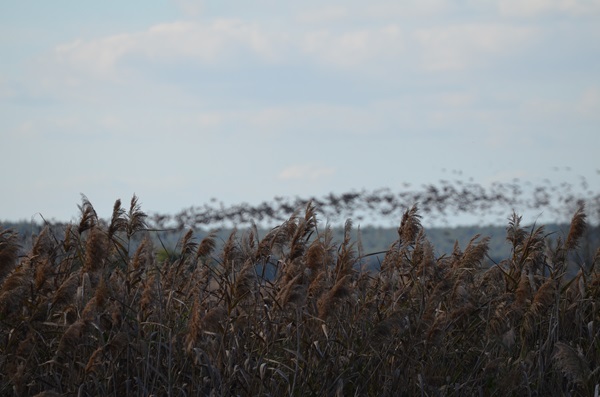 Inzwischen haben wir Oktober. Auf den Seen am Fließ sind wenig Gänse, denn es gibt kaum Wasser. Sie versammeln sich am Blankensee und auf den Wiesen in den Nieplitzauen (zu denen auch das Pfefferfließ gehört). Diese Bilder möchte ich zeigen, weil sie mich ermahnen, besser zu zielen. Schwarze Wolke am Horizont? Nein! Nur ein paar Hundert Gänse!