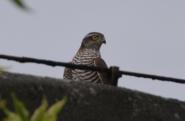 Ich hatte Glück, denn der Eindringling ließ sich nicht so leicht die Butter vom Brot nehmen. Er wurde gejagt, aber nicht vertrieben, und landete wieder auf einem Baracken-Dach. Ich war nur 15 m entfernt und die meisten Bilder wurden scharf. Trotzdem hielt ich ihn zunächst für einen Turmfalken, denn die gibt es am See, und die haben auch so einen wunderschön quergestreiften Schwanz. Allerdings war das Flugverhalten anders, und der Vogel war auch deutlich größer.