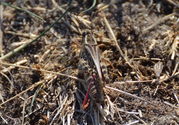 Ich hielt sie anfangs für einen ganz normalen Grashüpfer, aber bei der Recherche nach dem Grashüpfer mit blauen Flügeln bot mir Google auch „Grashüpfer mit roten Beinen“ an. Da habe ich dann doch mal nachgesehen, und bin auf diese Art gestoßen. Dieses Exemplar war ziemlich groß und fiel mir auf, weil es nicht nur hin und her sprang, sondern auch kurze Stecken flog. Das sieht man selten. Es landete auf dem Weg, und ich ging für ein Foto in die Hocke, als mein Hund mich überholte und dabei auf den Hüpfer trat. Nun, mein Hund ist nur mittelgroß, aber das Insekt wurde nicht beschädigt. Es musste nur seine (schönen roten) Hinterbeine neu sortieren. Sehr robust, diese Spezies!