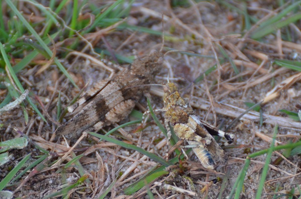 Und bei der Sichtung meiner Heuschreckenfotos habe ich dann noch diesen Schnappschuss entdeckt. Hier bohrt ein Hüpfer so demonstrativ seinen Hinterleib in den Boden, dass es sich nur um eine Eiablage handeln kann. Anhand der Färbung und Größe tippe ich auch auf den "Blauflügler".