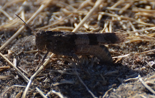 Aber wozu gibt es das Internet? „Heuschrecke mit blauen Flügeln“ ergab gleich 2 Treffer. Die blauflügelige Ödlandschrecke und die blauflügelige Sandschrecke. Bei Wikipedia war dann das sichere Unterscheidungsmerkmal beschrieben: das Nackenschild der Sandschrecke hat keinen „Längshügel“ oder Kiel. Nun, was das anging, waren meine Fotos aussagekräftig! Darum sorry, dass ich keinen farbenfrohen Wiesenbewohner vorstelle, sondern nur eine graue Heuschrecke. Aber ich schwöre, dass dieses Fotoobjekt blaugrün leuchtet, wenn es kurze Strecken fliegt.