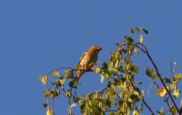 Es ist schon bestimmt 15 Jahre her, dass ich zu Weihnachten ein kleines Fernglas geschenkt bekam. Meine Augen funktionierten zu der Zeit zwar noch deutlich besser, aber wenn im Garten Vogelstimmen zu hören waren, die ich noch nicht kannte, oder Vögel auftauchten, die sich hoch in den Wipfeln versteckten, war ein Fernglas wirklich hilfreich. So identifizierte ich eines Tages einen Kernbeißer. Es war ein Männchen, das ziemlich kräftig gefärbt war, sich aber komplett unauffällig verhielt. Ich hätte ihn nicht bemerkt, wenn nicht ständig irgendwelche Teilchen aus dem Baum gerieselt wären. Offensichtlich machte er beim futtern eine ziemliche Sauerei. Was er sich da einverleibte, weiß ich nicht. Er knuspert wohl gerne Samen von Laubbäumen, und von denen gibt es hier genug, auch wenn die Nadelbäume überwiegen.