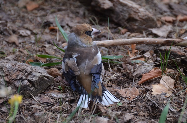 Ich tippte auf einen Jungvogel, und weil ich an den Flügeln blaue Federn erkannte, hoffte ich auf einen kleinen Eichelhäher. Leider irrte ich mich gewaltig. Es war ein Kernbeißer, und er war offensichtlich krank. Das linke Auge war nicht mehr als solches zu erkennen. Armes Tier!