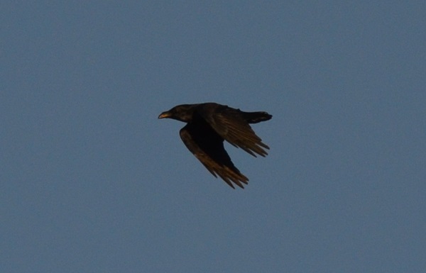 Und dann habe ich noch ein (unscharfes, weil weit entferntes) Foto auf der großen Wiese geschossen, auf dem ein Rabe schienbar einen Stein „erbeutet“ hat. Keine Ahnung, wozu er ihn braucht, aber er flog damit im Schnabel weg.