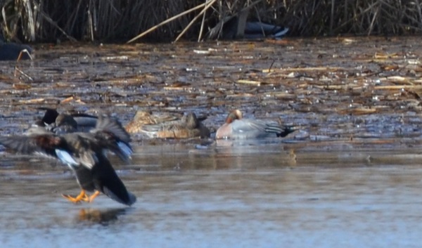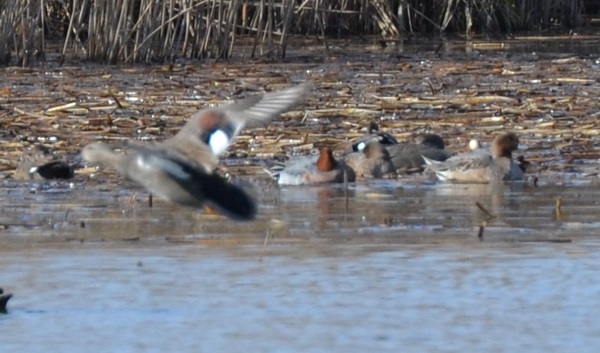 Im Februar 2019 tauchten endlich mal wieder ein paar „Gast-Enten“ am Fließ auf. Die Rufe der Pfeifenten sind sehr gut zu erkennen, aber ich bekam kein Exemplar zu Gesicht. Weil ich aber weiß, dass sich in Schwärmen viele verschiedene Arten friedlich mischen, mache ich grundsätzlich ein paar Gruppenfotos und hoffe auf einen Treffer. Im März dümpelte dann eine ansehnliche Gruppe am östlichen Rand des kleineren See`s am Fließ. Dort hatte sich ein „Teppich“ aus Schilfresten gebildet, der wohl zum Ausruhen besonders einladend war und von allen Entenvögeln genutzt wurde. Die Schnatterenten waren deutlich in der Überzahl, aber auf einigen Bildern erkannte ich die roten Köpfe mit dem weißen Streifen.