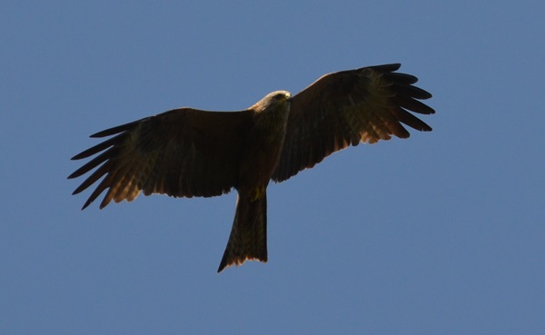 größer als der Rotmilan (Beweisfotos siehe Rotmilan), komplett dunkelbrauner Vogel ohne besondere Zeichnung, dunkelgrauer Kopf wie der Rotmilan, gelber Schnabel, gelbe Füße
