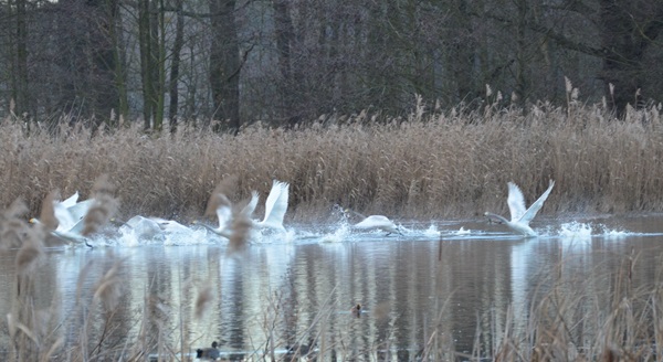 Als die Vögel dann über den Bäumen am See aufstiegen, zückte ich die Kamera und machte Fotos. Ich rechnete nicht mit einer Sensation. Schon bald war mir klar, dass es Schwäne waren. Aber die allgegenwärtigen Höckerschwäne rufen meistens nicht beim Fliegen, doch sie machen mit ihren Flügeln laute, pfeifende, weit hörbare Geräusche. Diese Schwäne flogen (von den Rufen abgesehen) lautlos.