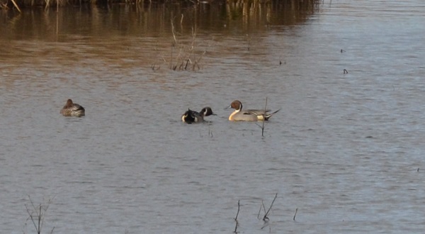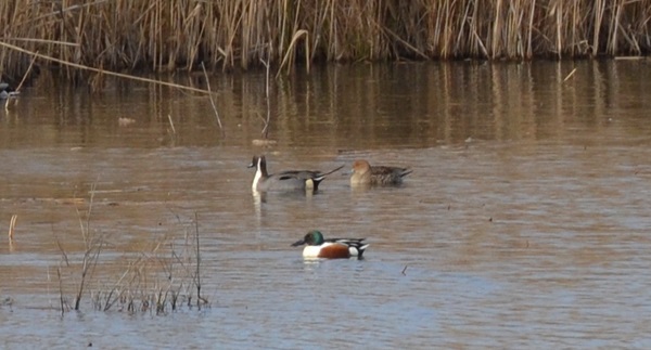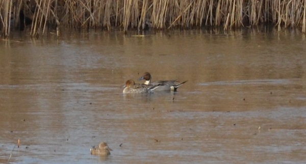 An einem sonnigen, frischen Tag im März 2019 waren endlich mal wieder ein paar Enten auf dem See am Pfefferfließ zu entdecken. Ich hörte Pfeifenten, konnte sie aber auf die Entfernung nicht in der Menge lokalisieren. Dafür fielen mir ein paar Vögel auf, die eine weiße Brust hatten. Ich tippte auf Spießenten, machte viele Fotos und lag richtig. Für die Entfernung waren die Bilder ziemlich aussagekräftig. Es handelte sich um zwei Paare.