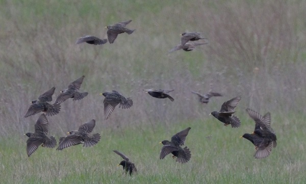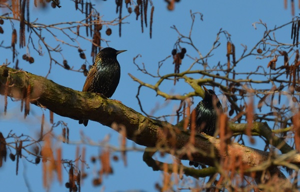 Einige Tage später, als die Sonne die Wiese am See erwärmte, sah ich dann einen kleinen Trupp beim Picken und Wegfliegen. Eindeutig Stare! Schön, dass sie wieder da sind! Im März gelang mir dann eine hinreißende Fotostrecke von einem Staren-Paar, wobei er sich aufplusterte und tirilierte (auf dem Foto naturgemäß nicht zu hören) und sie fast geduldig daneben saß.