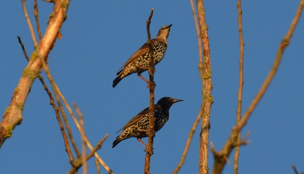 2016 im Februar (es lag Schnee) streifte ich mal wieder mit der Kamera am Ufer des Sees, als ich ein paar Vögel wunderbar singen hörte. Sie verursachten auch lustige Klicker-Geräusche. Ich konnte sie kaum ausmachen, denn sie saßen hoch in den Bäumen, und die stehen am Ufer ziemlich dicht. Irgendwann gelangen mir ein paar Fotos, die ich zu Hause vergrößern und aufhellen musste. Die Vögel waren dunkelbraun mit hellen Flecken auf dem Rücken. Der einzige Vogel in meinem schlauen Vogelbuch, zu dem die Beschreibung passte, war der Star. Ich war etwas verwirrt, weil ich dachte, ich würde Stare gut (er)kennen. Im Nachhinein vermute ich, dass sie sich wegen der Kälte ziemlich aufgeplustert hatten, wodurch ihr sonst so schönes schwarzglänzendes Federkleid einfach nicht seine gewohnte Strahlkraft entfalten konnte. Sie sahen auch deutlich pummeliger aus, als ich es in Erinnerung hatte. Und fleckiger! Erst ein halbes Jahr später habe ich das mit dem „Ruhekleid“ rausgefunden (siehe oben), aber das ist ja kein Wunder. Normalerweise sind die Stare ja weit weg, wenn sie ihr Winterkleid tragen.