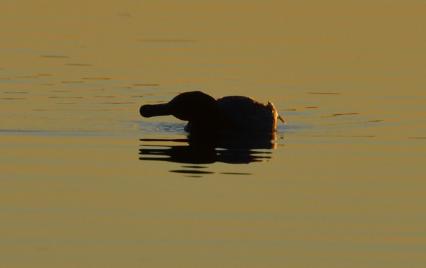 Weil ich beim Warten auf den Sonnenuntergang viel Muße hatte, versuchte ich, ein „Abtauch-Foto“ hin zu bekommen. Die Vögel machen dann einen Bogen. Aber ich war immer zu spät dran. Bestenfalls hatte ich noch ein paar Schwanzfedern auf dem Bild. Die nächsten beiden Bilder fallen also unter die Kategorie „Fehlversuch mit fotografischem Wert“. Aber zum Glück habe ich auf meinen allersten Fotos der Tafelente zufällig die Stadien des Eintauchens erwischt.