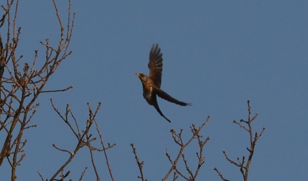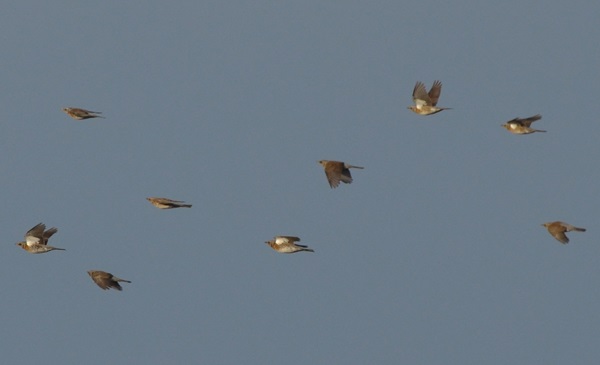 Der Schwarm saß damals auf der großen Wiese (und später in einem Baum, nachdem ich ihn aufgeschreckt hatte) und auf einem Feld mit Winterroggen. Erst im Januar des nächsten Jahres sah ich diese Vogelart wieder. Im Februar war sie dann fast täglich auf der großen Wiese anzutreffen, offensichtlich war der Tisch reich gedeckt. Das Gras vom Vorjahr war noch ziemlich hoch, und die Vögel waren darin kaum zu entdecken. Nur an manchen kahleren Stellen oder Bodenwellen konnte ich ein paar Fotos machen. An einem sonnigen Märztag gelang mir dann eine nette Flugstudie.