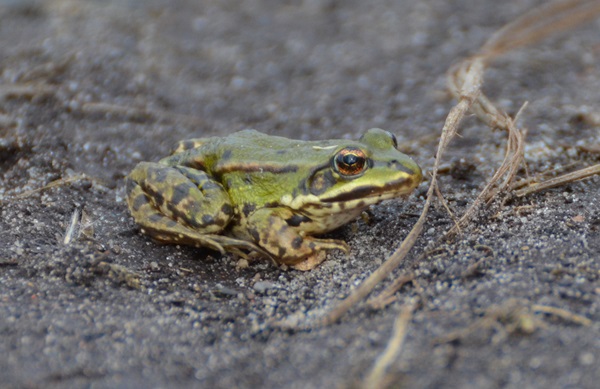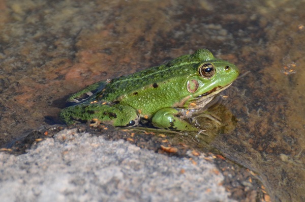 Ich finde diesen Frosch einfach super fotogen. Auf einem neueren Bild habe ich sehen könne, dass seine Unterseite fast weiß ist. Ich warte jetzt auf einen tollen Tag, an dem ich Fotos machen kann, wenn er (aufgeschreckt von meinem Hund) elegant vom Ufer (wo er die meiste Zeit des Tages zu verbringen scheint) ins Wasser springt.
